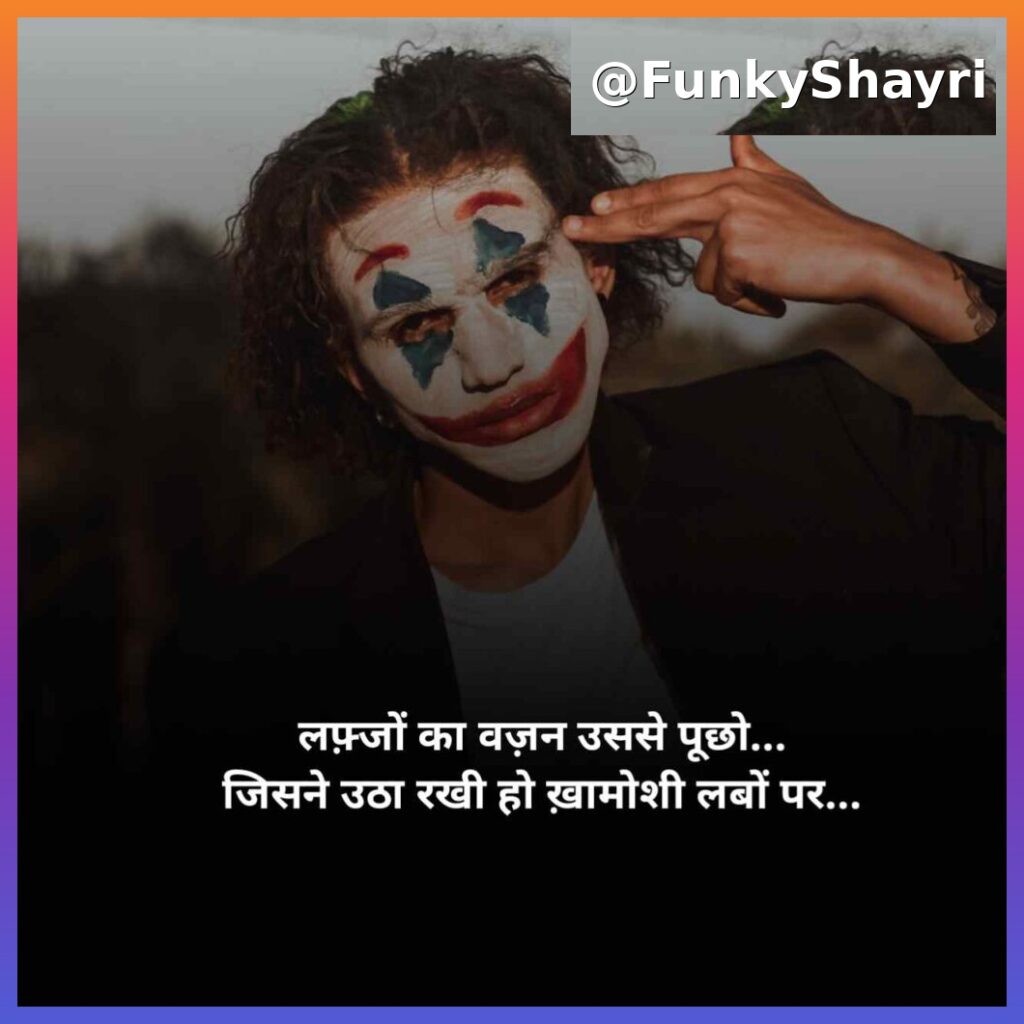 Funkyshayri.com पर आपका स्वागत है। अगर आप Khamoshi Shayari ढूंढ रहे हैं, तो आप सही जगह पर आए हैं। यहाँ आपको खामोशी, जज़्बात, दर्द, तन्हाई और जिंदगी के एहसासों से जुड़ी बेहतरीन खामोशी शायरी 2 लाइन पढ़ने को मिलेंगी। आप इन शायरियों को WhatsApp, Facebook, Instagram पर share करके अपने अनकहे एहसासों को खूबसूरत शब्दों में बयां कर सकते हैं।